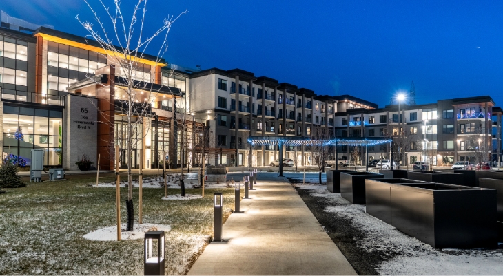 The Meadows Retirement Residence, built by Janzen Builders, is a modern senior living community. Located at 65 Des Hivernants Boulevard North, The Meadows offers one- and two-bedroom suites with high-end finishes, in-suite laundry, and private balconies. Concrete construction ensures a quiet and comfortable living experience.