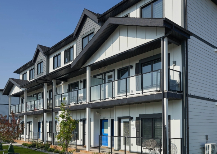 Latitude 49 Townhomes, managed by Deveraux Apartment Communities, offers modern, farmhouse-inspired one- and three-bedroom townhomes at 40 Des Hivernants Boulevard North. Features include walk-in closets, ensuite bathrooms, and high-end finishes.